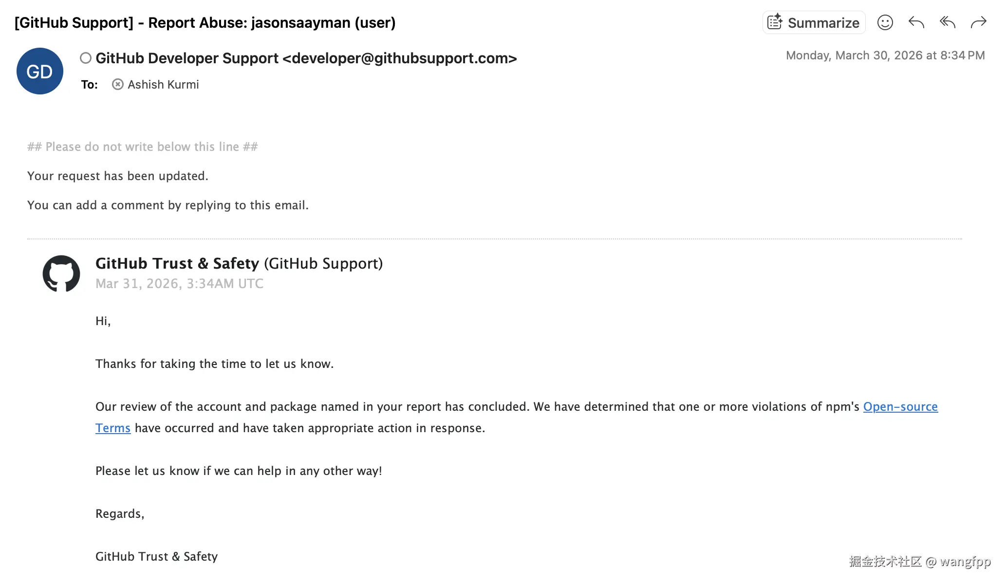 在 GitHub 上这场猫鼠游戏上演的同时,Ashish 也提交了一份 GitHub 账户滥用工单,解释说维护者的账户似乎已被盗用,并被用于删除合法的安全公告。GitHub 和 npm 支持团队都迅速采取了行动。GitHub 暂停了被盗用的维护者账户,阻止了问题删除行为,并防止了该账户进行任何进一步的恶意操作。