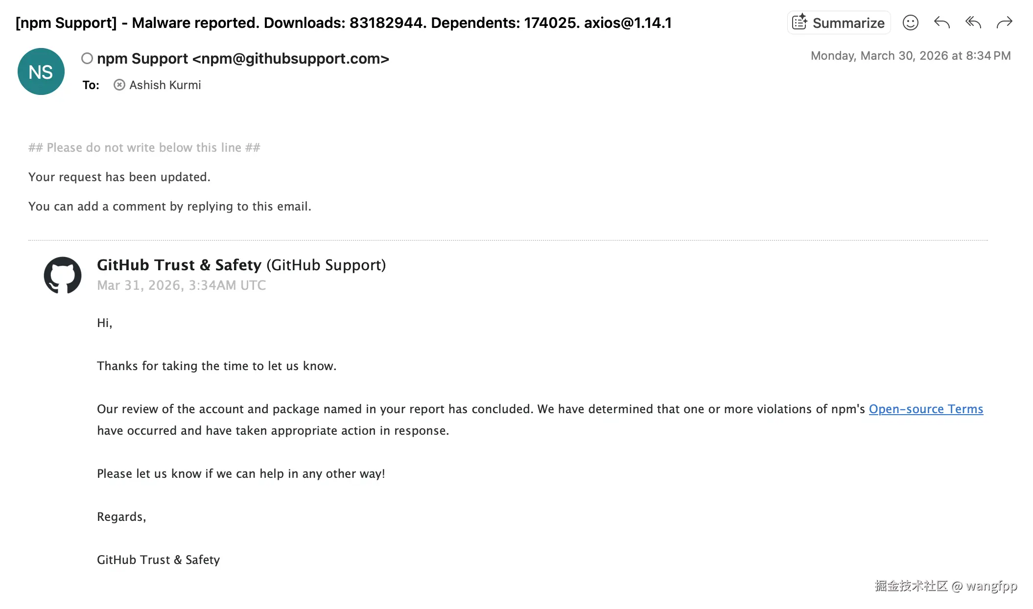 他还向 npm 报告了这些被入侵的软件包是恶意软件,标记了 axios@1.14.1 和 axios@0.30.4 以及恶意 plain-crypto-js 依赖项。