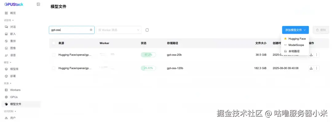 在 GPUStack UI 点击模型文件菜单,选择添加模型文件,可以从 Hugging Face 或 ModelScope 联网下载模型文件。国内网络建议从 ModelScope 搜索并下载 gpt-oss-120b 和 gpt-oss-20b 模型。