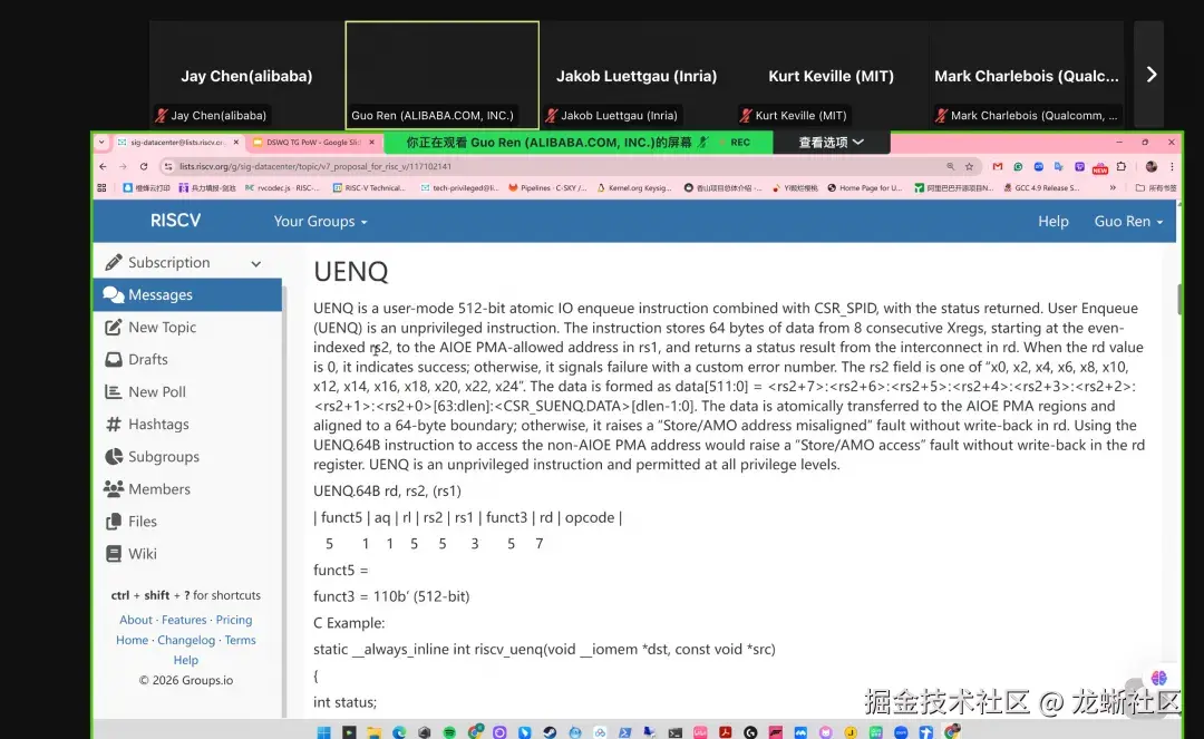 RISC-V International Data Center SIG 近期召开线上双周例会,本次会议在完成例行的社区协作、反垄断与出口管制等合规提示后,进入技术讨论环节:与会者集中评审 Atomic I/O Enqueue(AIOE / Atomic IONQ)扩展提案 v4。来自 Inria、Qualcomm、阿里巴巴等机构的代表参会并确认讨论细节。