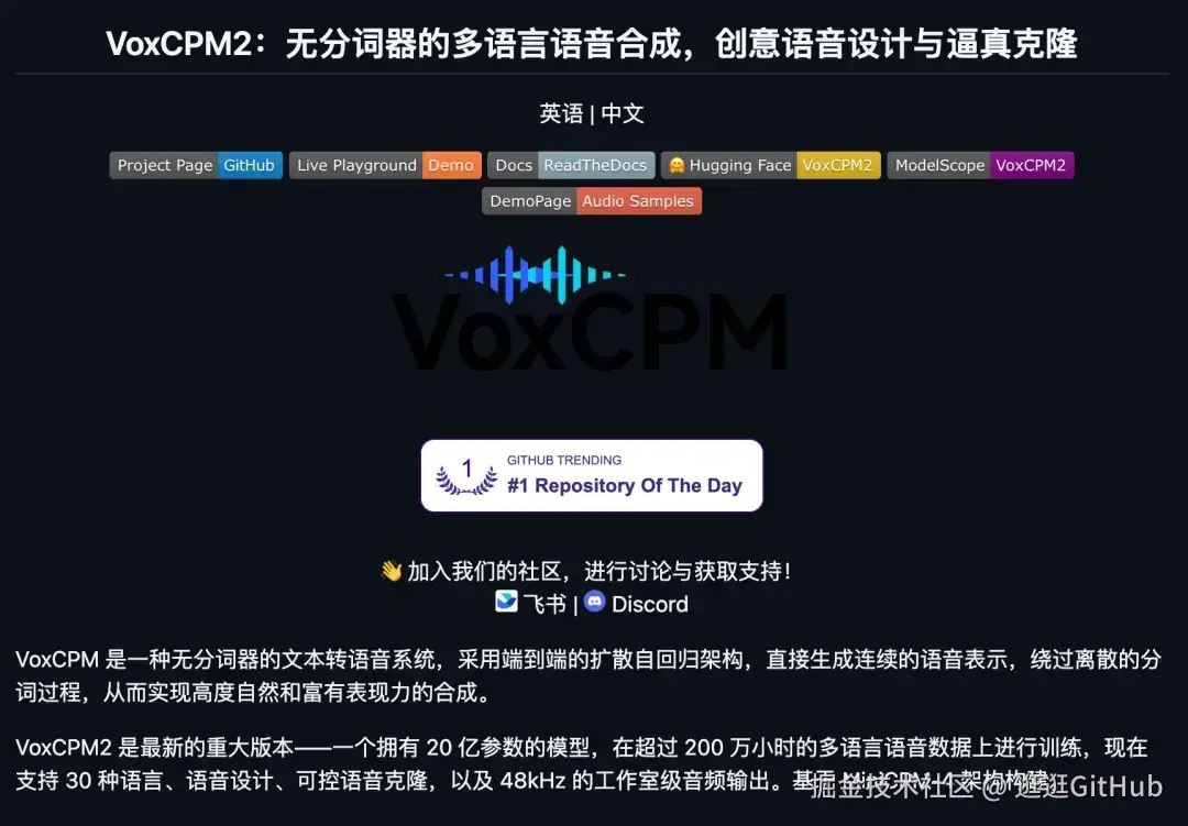 到了 VoxCPM 2 这一代,基本上把开源语音模型能做的事情全做了。
