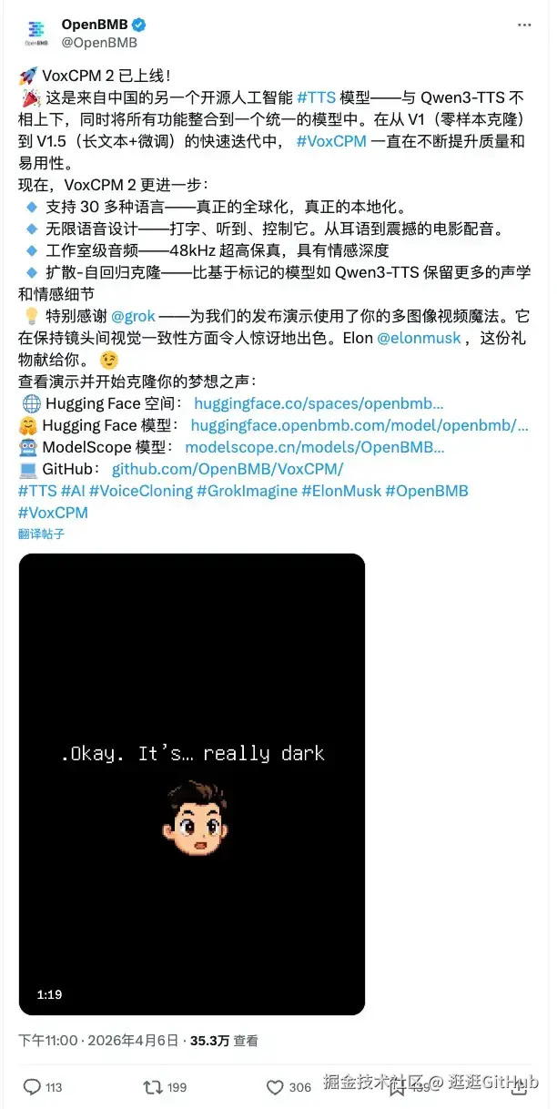 Hugging Face链接:https://huggingface.openbmb.com/model/openbmb/VoxCPM2