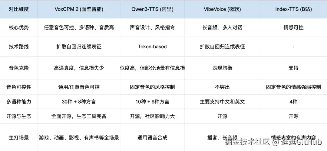 - VoxCPM 2(2026.04) :2B 参数,48kHz 采样率,30 种全球语言 + 8 种中国方言