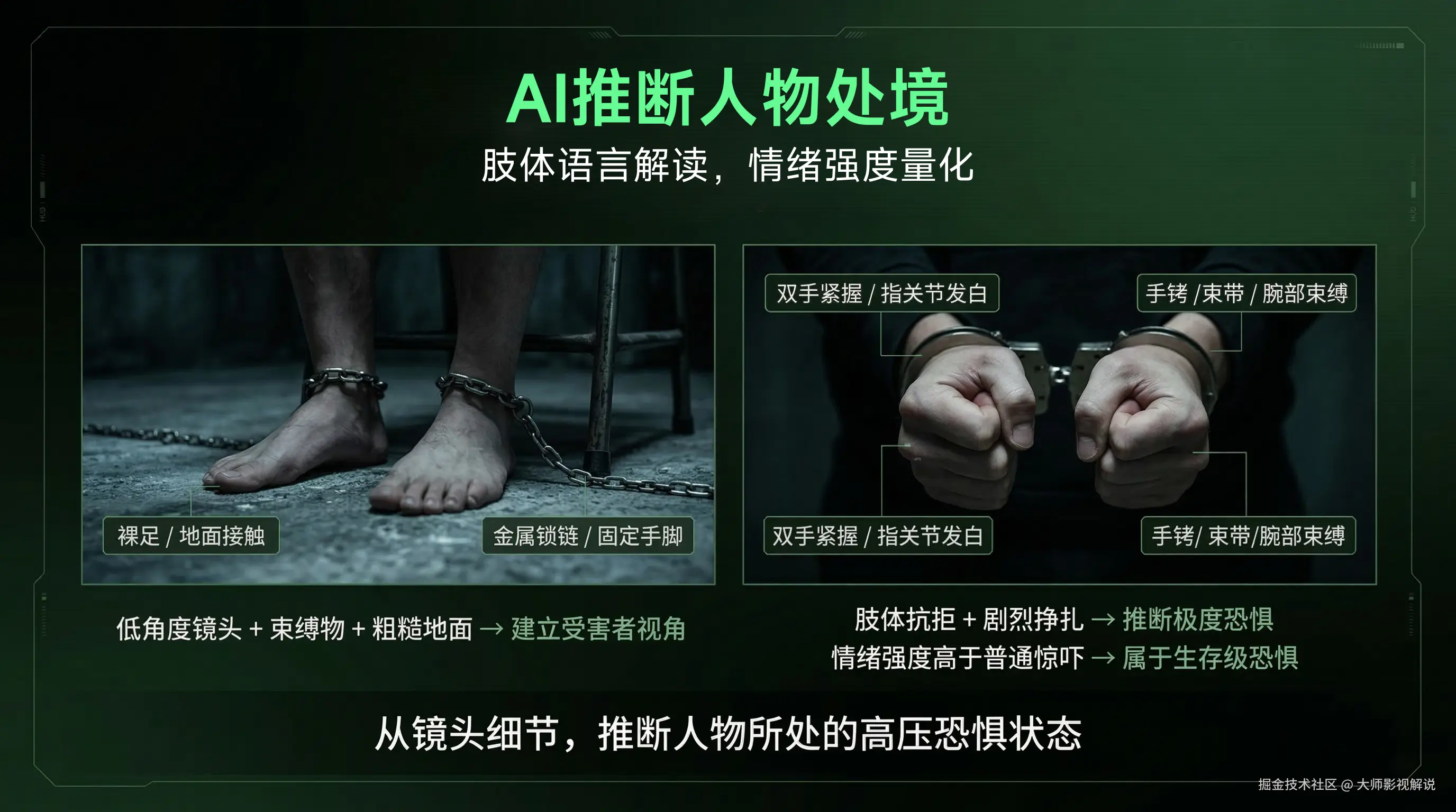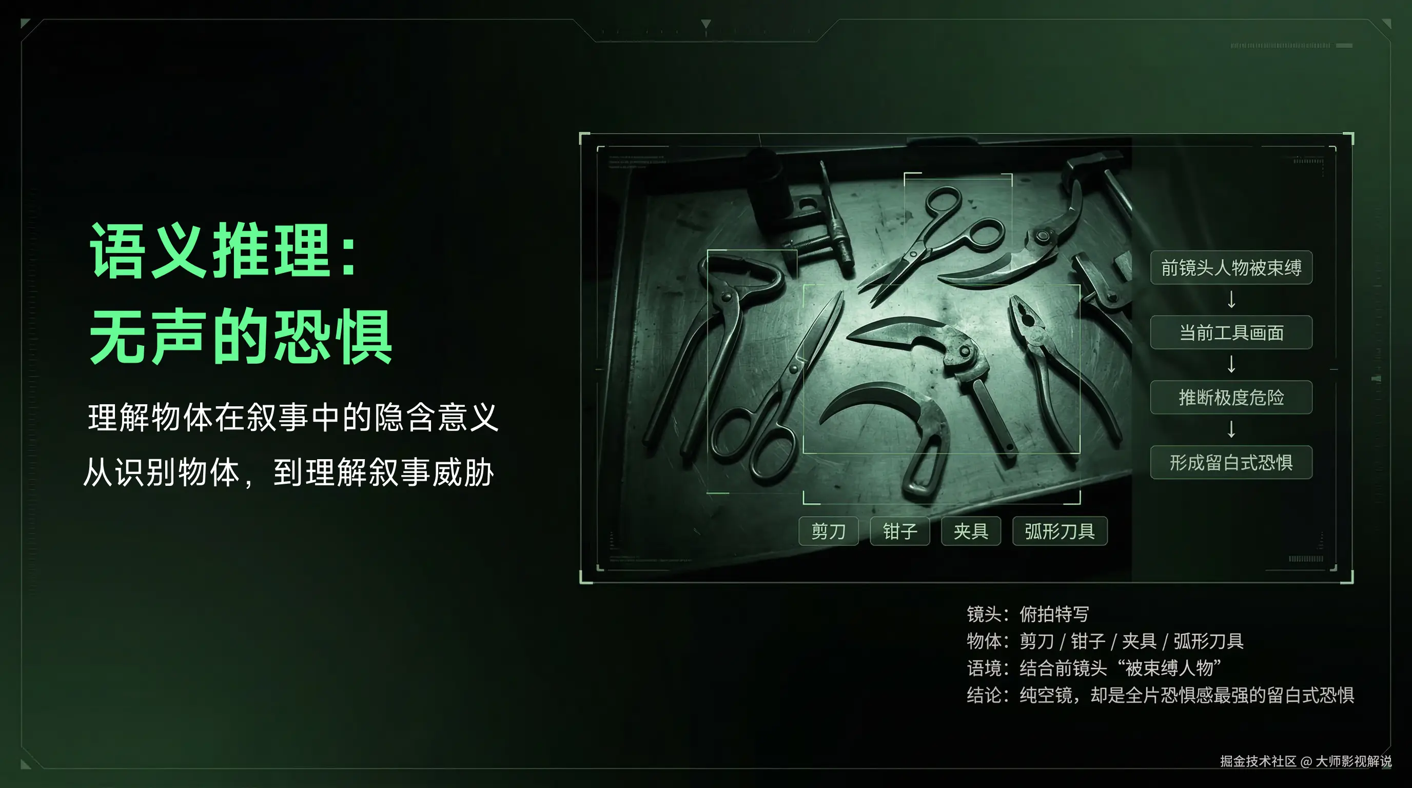 它能帮的第二件事是把情绪和画面对上。你的文案里写「他感到一阵寒意」,它能给你匹配上那些画面里没有明显动作、但氛围不对的镜头。这类镜头在恐怖片里特别多——一个俯拍的桌面上摆着几件工具、一扇半开的门、一个走廊尽头的阴影——这些镜头在传统素材管理系统里根本没法检索,因为它们没有「事件」,只有「氛围」。但恐怖片真正的恐怖感恰恰是从这些镜头里来的,业内叫它留白式恐惧。把这类镜头找出来并和对应的文案对上,这一步在过去是只有资深剪辑师脑子里才有的隐性知识,现在被工具接住了。
