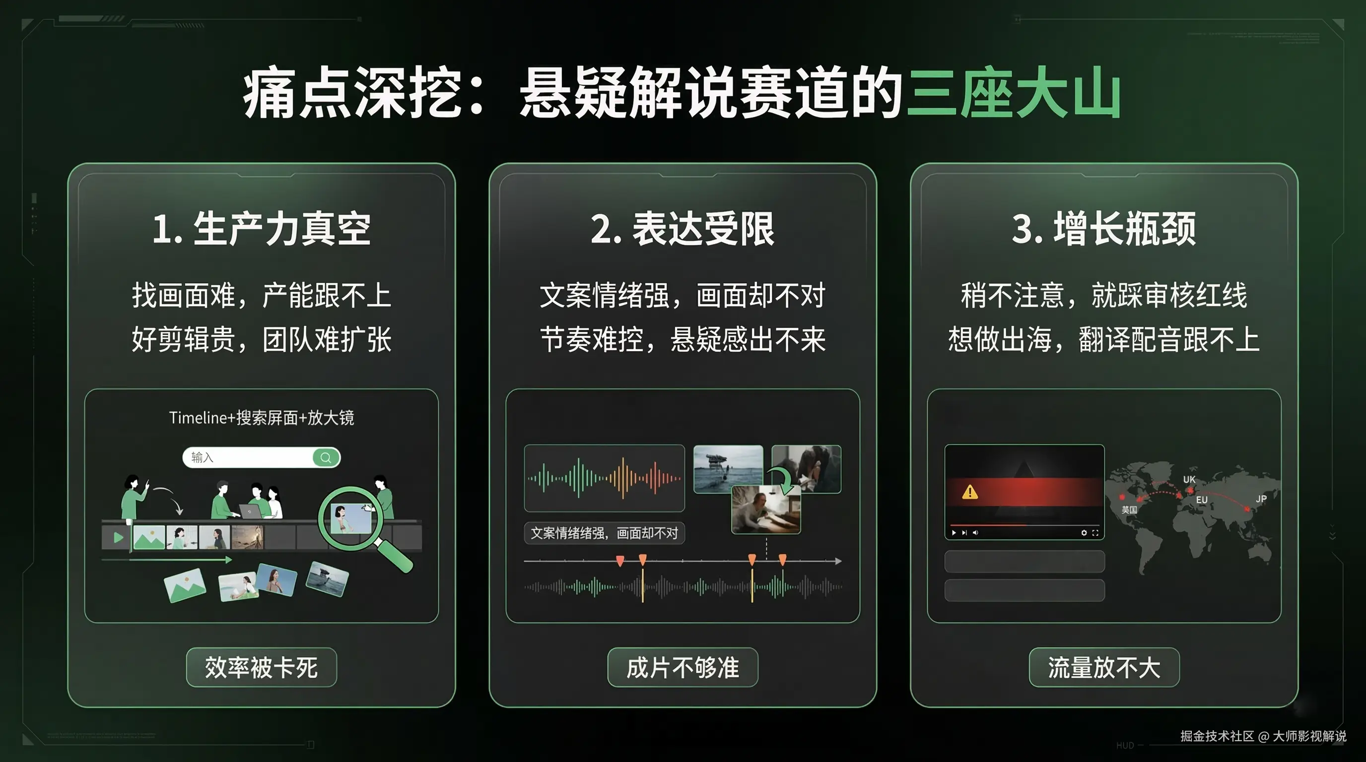 很多人以为恐怖片解说的门槛在剪辑手法,其实不是。剪辑手法大家都能学会,真正把人卡住的是另外三件事。我把它们叫做这个赛道的三座大山,任何一座翻不过去,你就做不下去。