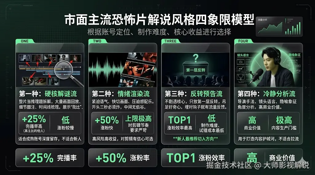 讲完难点,说一下具体怎么做。我把市面上能跑出来的恐怖片解说大致分成四种风格,你可以根据自己的账号定位选一种切入。