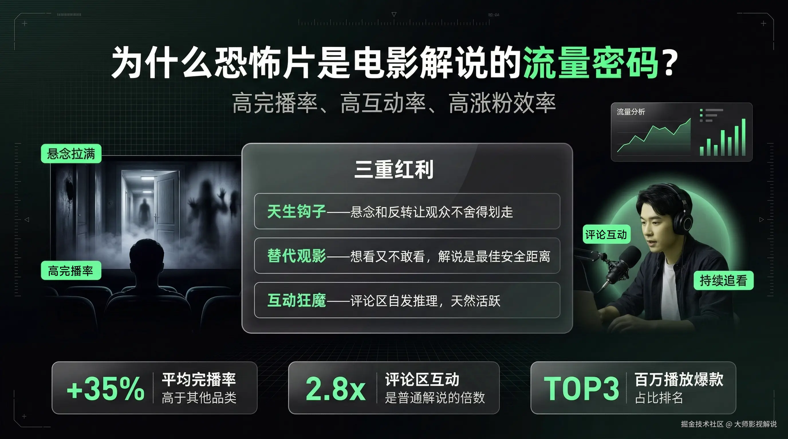 同样是做电影解说,爱情片已经被做烂了,漫威解说卷到需要自带梗和人设才能出头,文艺片受众太窄,科幻片的视觉成本又太高。真正还留着空间的细分方向不多,恐怖悬疑是其中完播率和互动率都明显高出一截的一类。