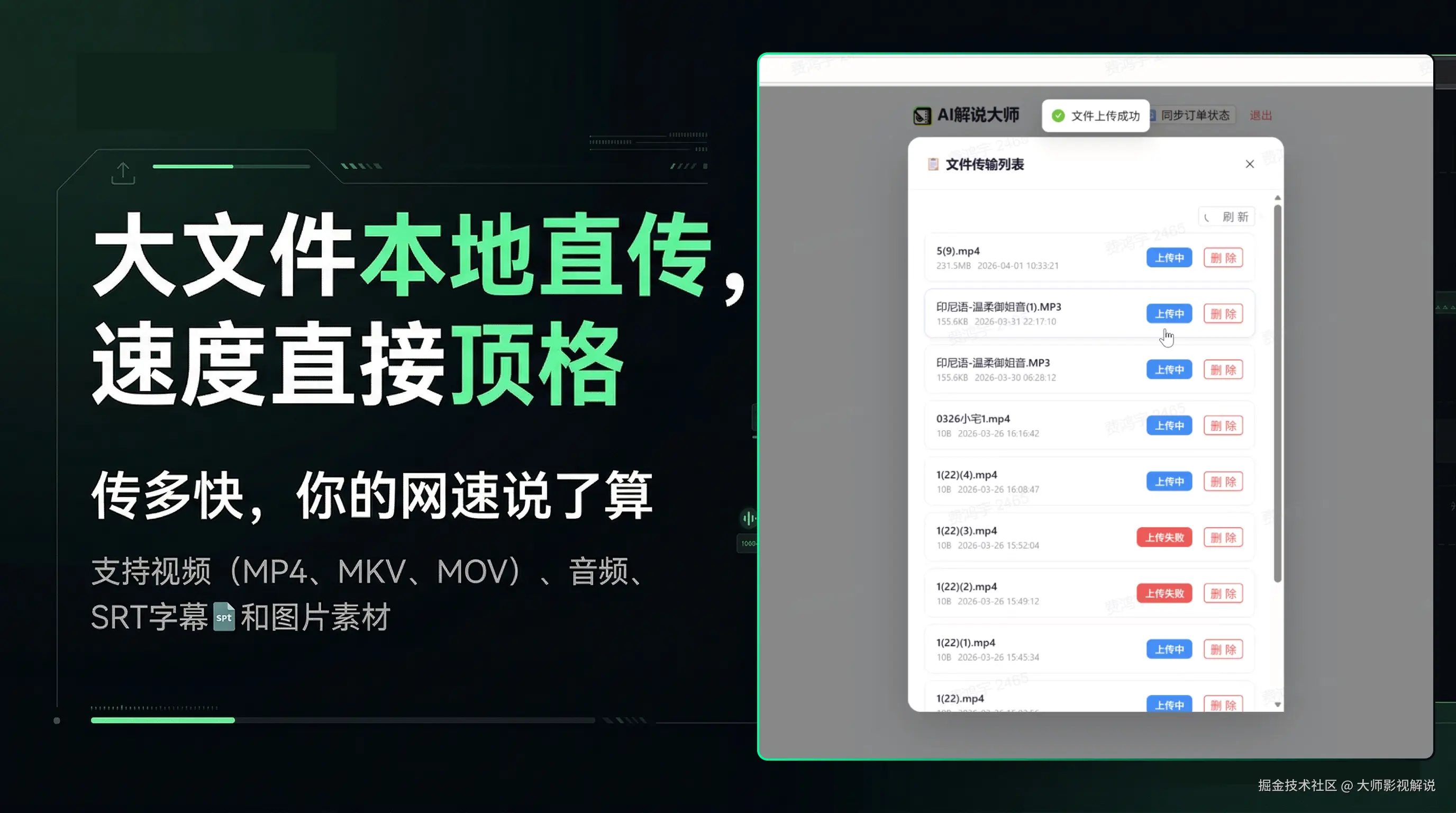以前处理素材,中间那一段百度网盘中转是真的折磨,限速、要等、要复制链接、要粘贴转存、要等系统识别,一条片子还没开始做,心气已经先被耗掉一半。现在网页端可以直接把本地视频拖进去,速度只由本地网速决定,不再被中间环节卡住。