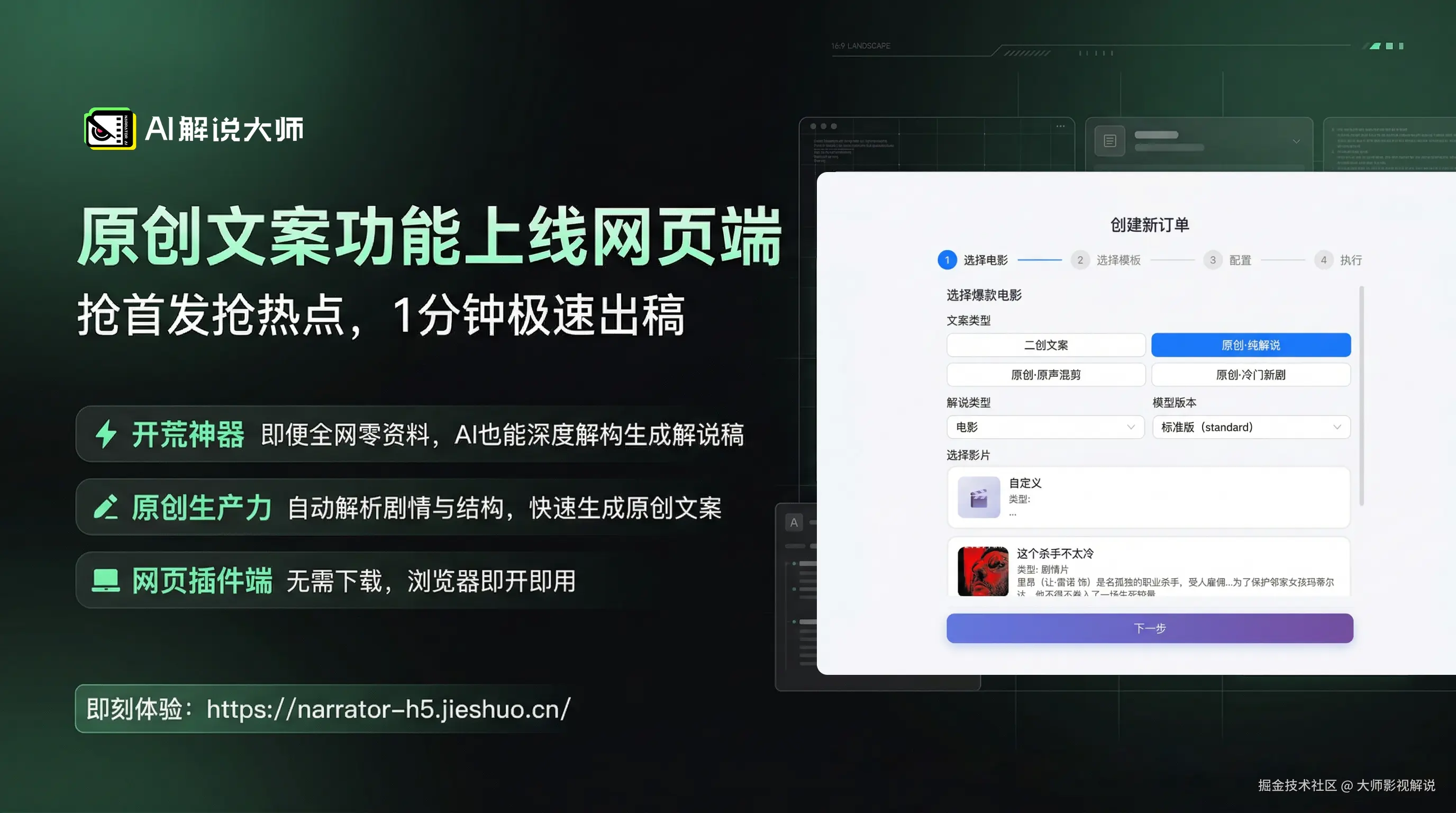 我最近在试一个叫 AI 解说大师的工具,主要是冲着它的网页端去的。我不太想再装客户端了,电脑里已经有一堆剪辑软件和素材管理工具,能在浏览器里跑完的事情我尽量不落地。用下来有几个点值得说一下,不是功能罗列,是我自己真正用得上的部分。