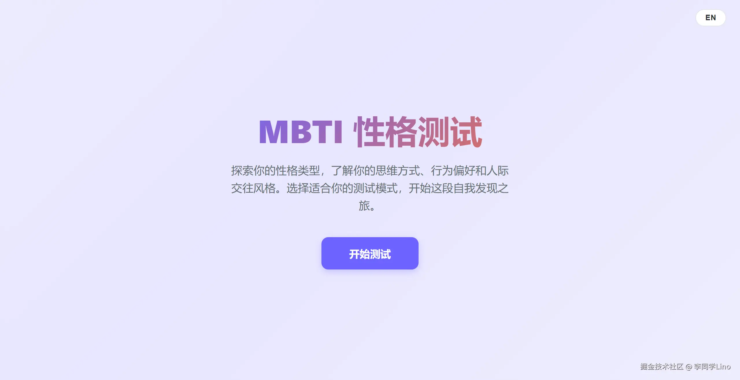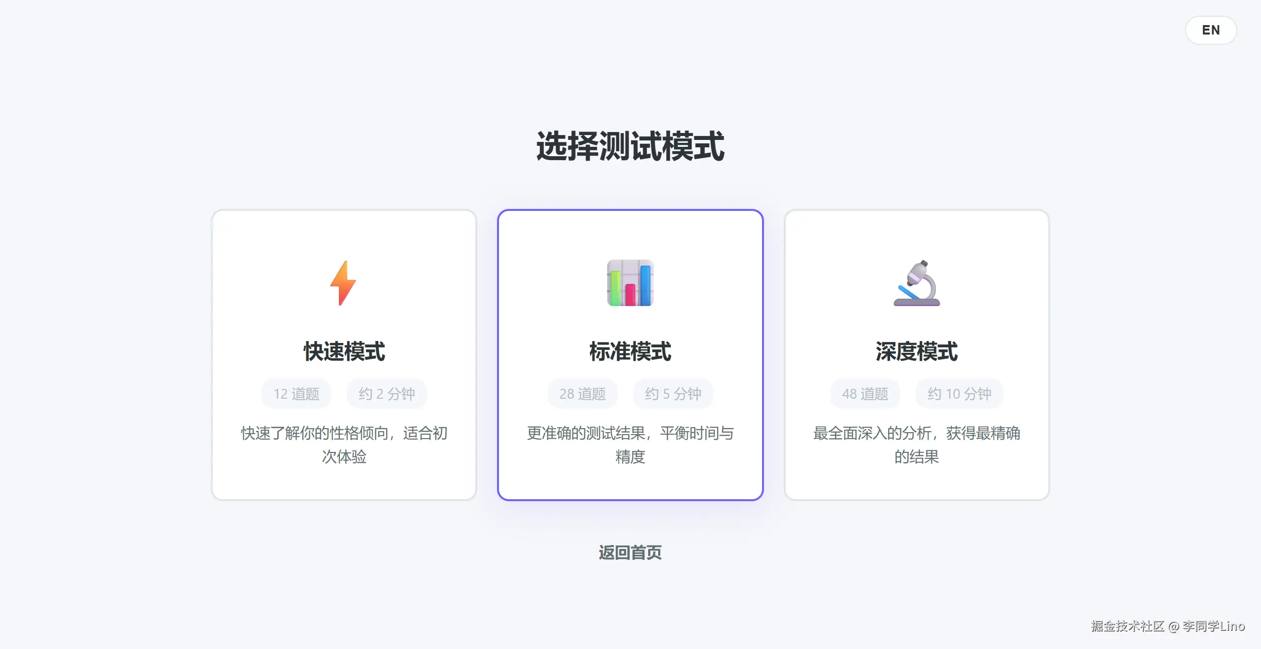 大家看看这个首页和模式选择页。极其克制的留白,高级感拉满的渐变紫主题色,右上角甚至还真给我把中英文切换的 Toggle 给做出来了,点击秒切,丝滑无比。