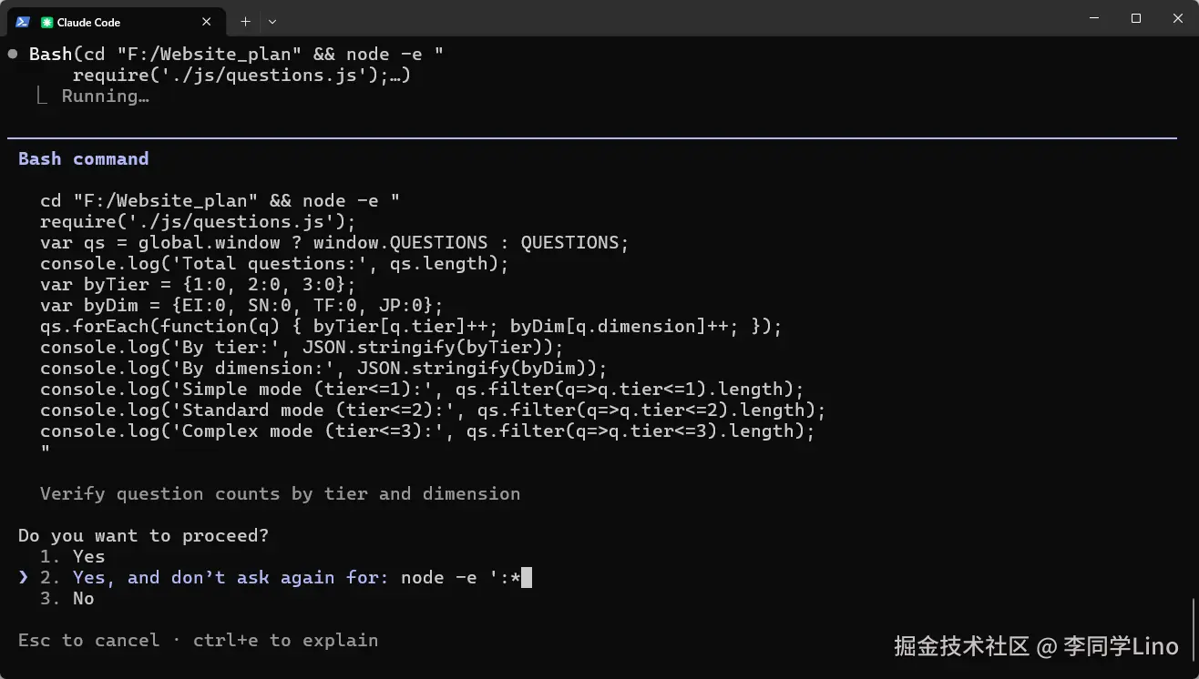 它在写完 questions.js(核心题库文件)之后,并没有急着去写下一个模块,而是反手在我的终端里挂起了一段极其专业的 Node.js 测试脚本!