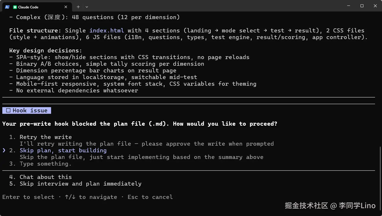 在真实的本地开发环境里,Vibe Coding 往往不是一帆风顺的。因为我本地工程目录的一些拦截配置(pre-write hook),阻断了它在本地物理生成那份 .md 计划文档的操作。