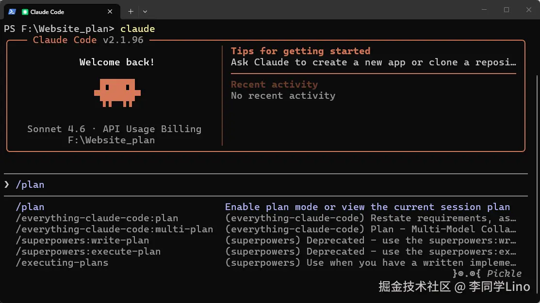 我并没有写什么长达几千字的 Prompt,我只是在 Claude Code 终端里轻飘飘地敲下了 /plan 进入规划模式。
