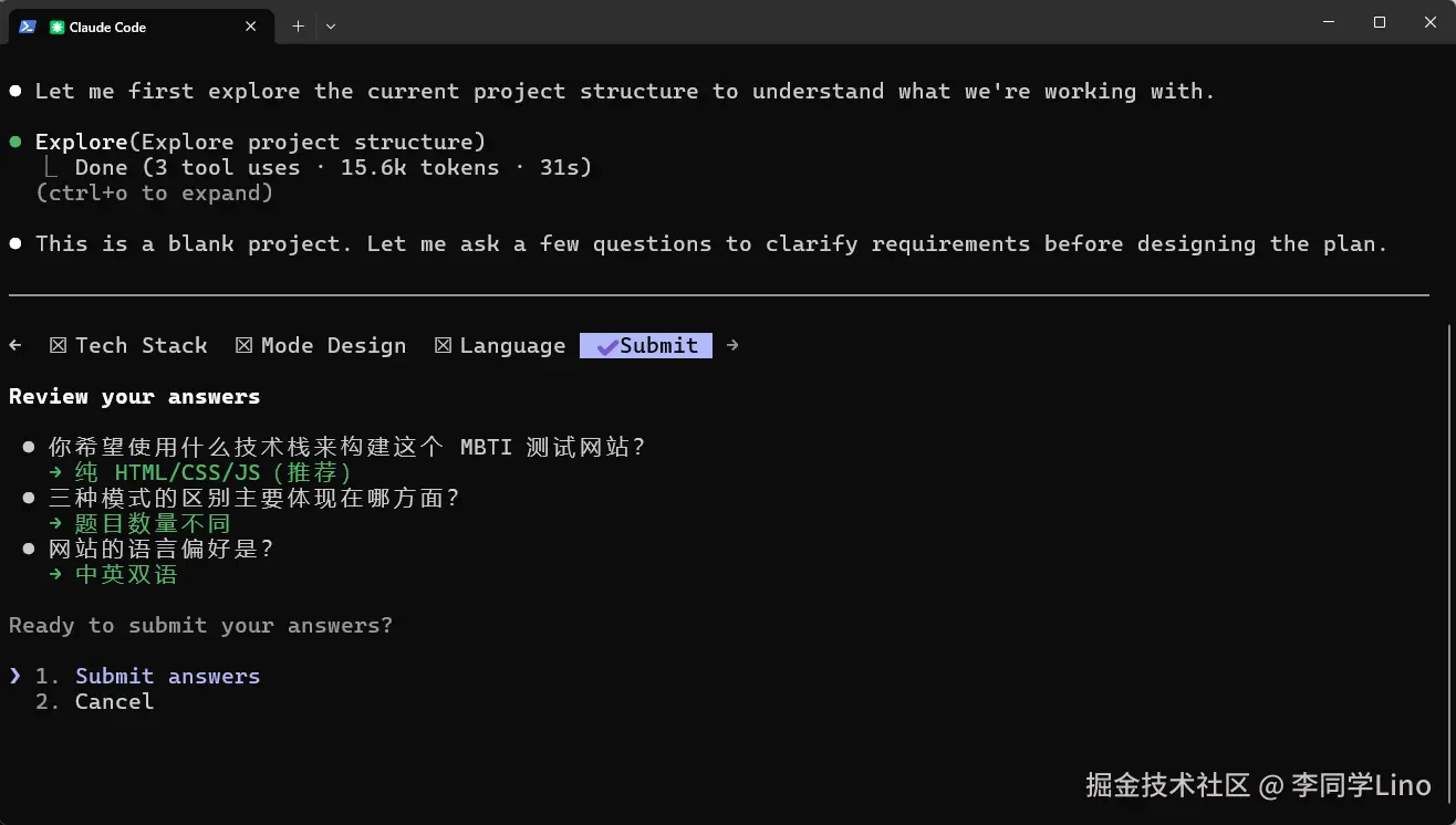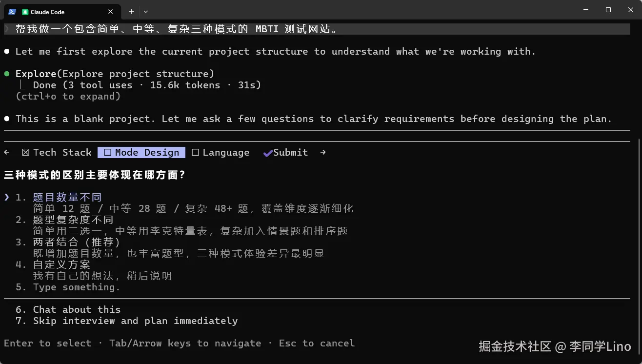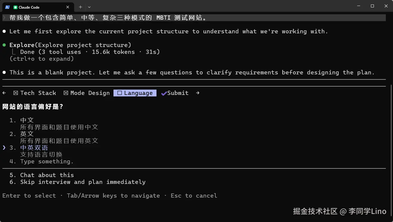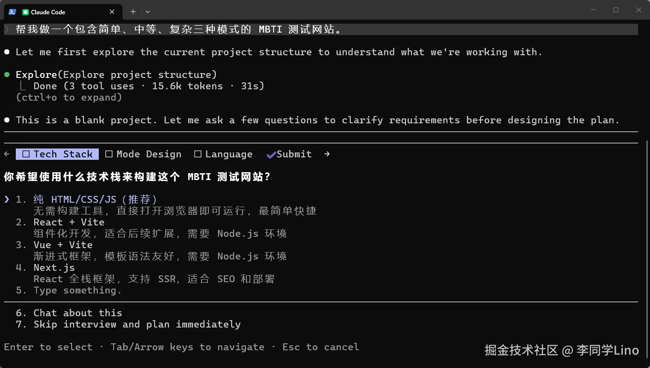 它做的第一件事,不是回答,而是先去默默扫描了我当前的工程目录。发现这还是个空项目后,它直接在终端里给我拉起了一个带有顶部导航栏的可交互“需求调研表”!