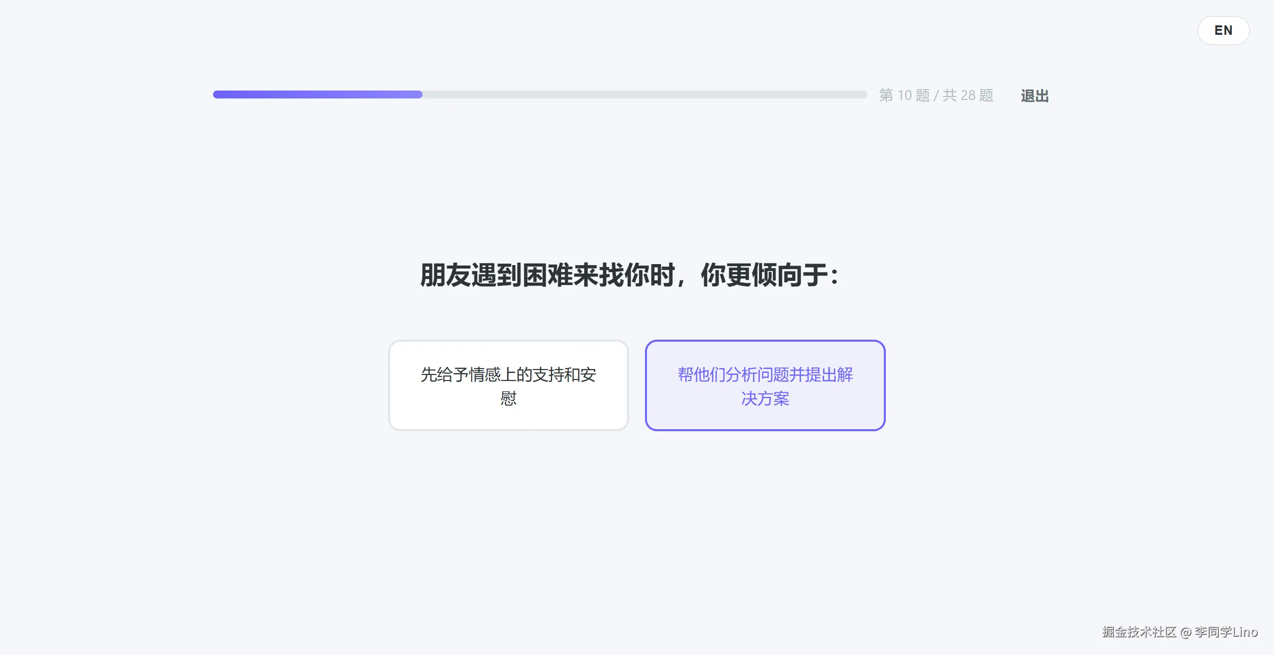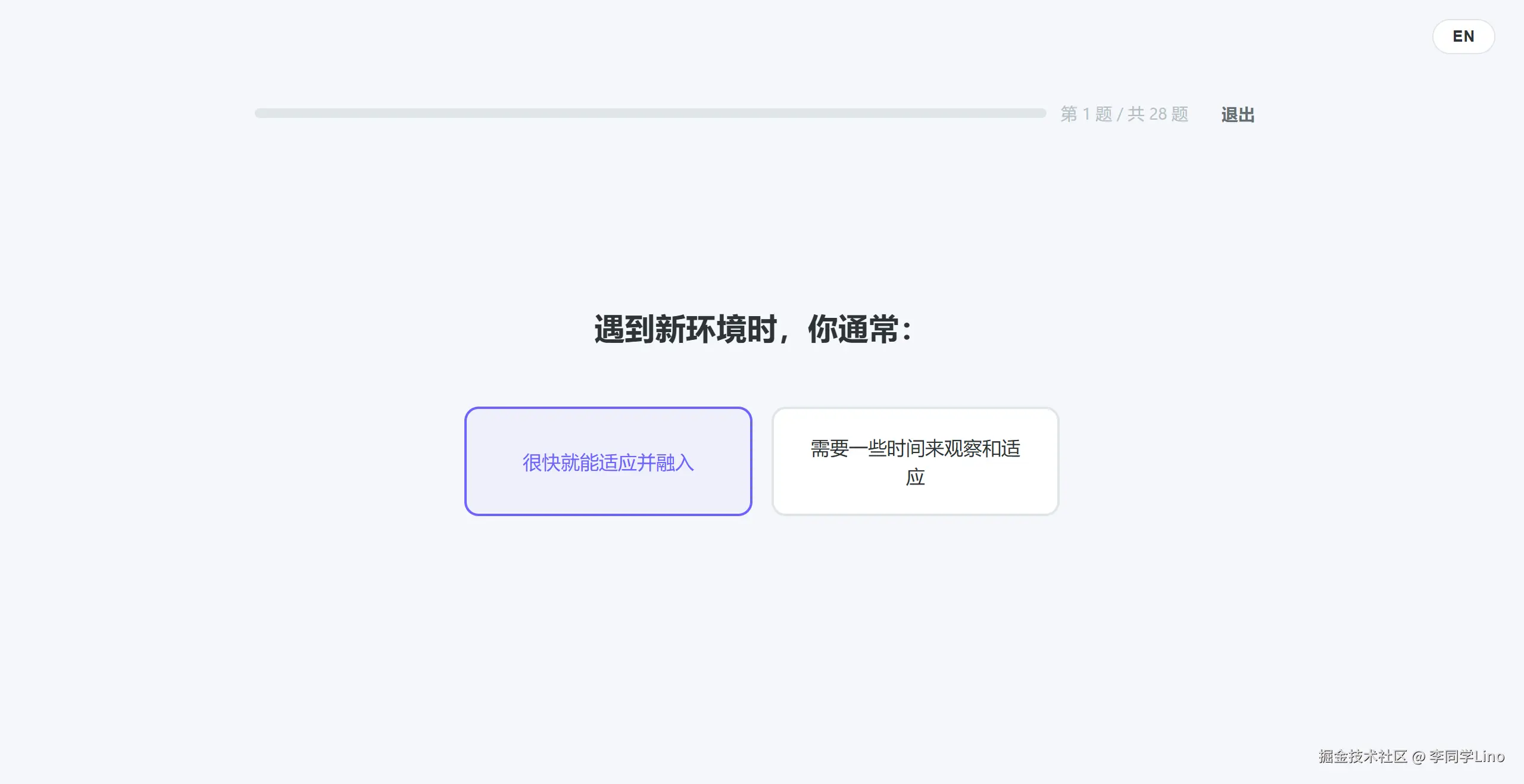 进入答题环节,体验更是直线拉升。 顶部的进度条随着答题实时平滑推进,选项按钮的 Hover 态和选中状态极具呼吸感。它不仅实现了纯前端的 SPA(单页应用)体验,全程零刷新,而且真的支持了我前面提到的键盘快捷键(按 1 或 2 直接答题)。