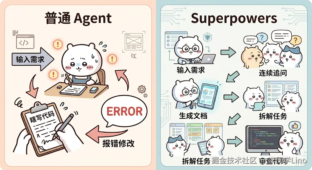 在不用Superpowers之前,我看着AI写出来的代码,经常感觉血压飙升。因为AI的默认行为模式是“填空题”思维——你给多少,它写多少,遇到没说清楚的边界条件,它就开始“自行脑补”。