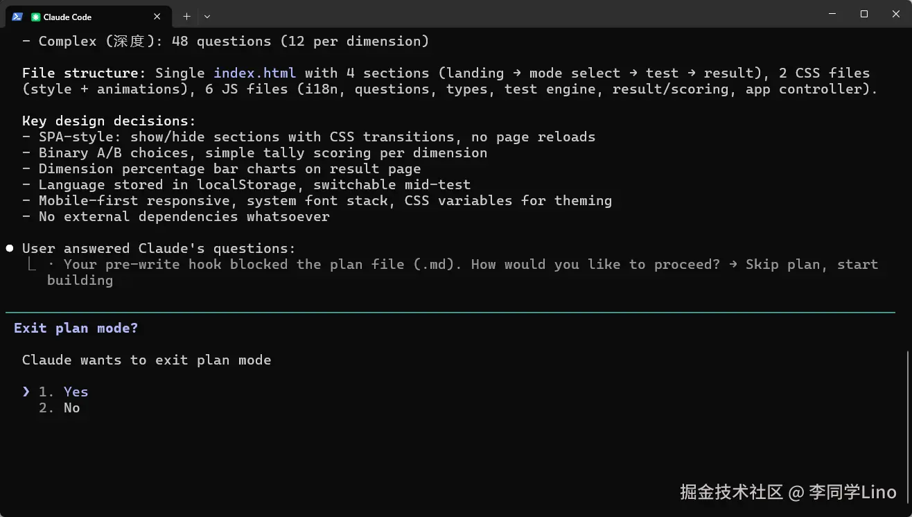 这句 Exit plan mode?,其实就是 AI 在正式向我请示: “老板,地基已经打好,蓝图已经全部刻在我的脑子里了。现在,我要脱掉产品经理和架构师的西装,换上底层码农的格子衫,正式下车间去给你搬砖写代码了。你批准吗?”