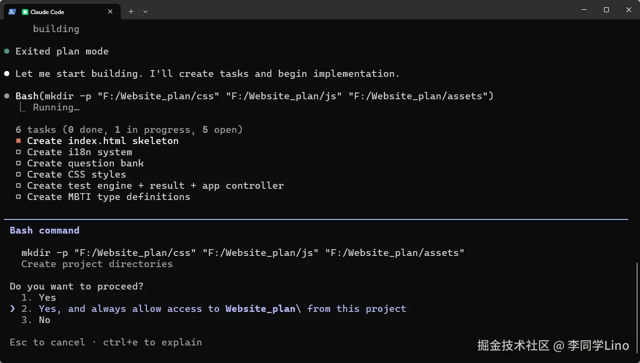 紧接着,它没有在屏幕上“默写”代码,而是直接**调用了物理机的 Bash 命令**: mkdir -p "F:/Website_plan/css" "F:/Website_plan/js" "F:/Website_plan/assets"