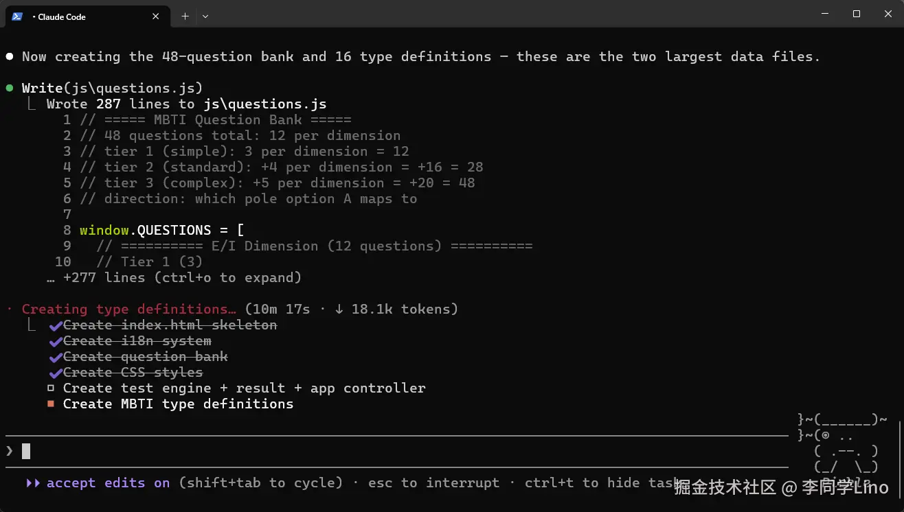 授权允许它操作本地文件后,我原本以为,接下来就是看着它一行行往 index.html 或者 questions.js 里无脑填代码的过程。毕竟大模型嘛,生成代码的速度大家早就见怪不怪了。