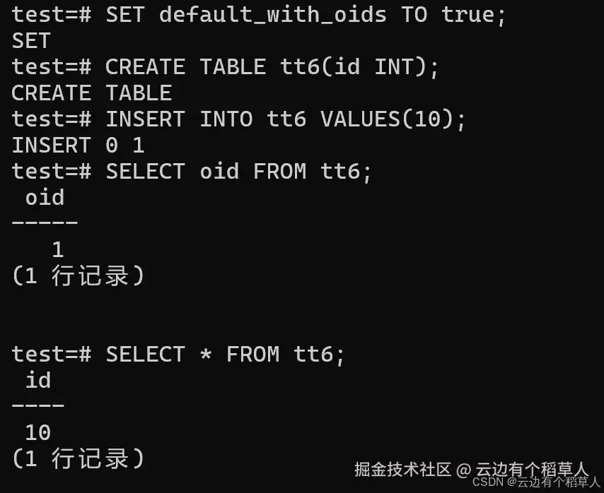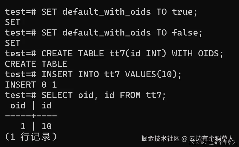 default_with_oids=true; - 建表语句显式指定