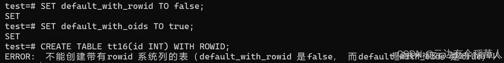开启后,所有新建表自动携带 ROWID 隐藏列,default_with_oids自动失效: