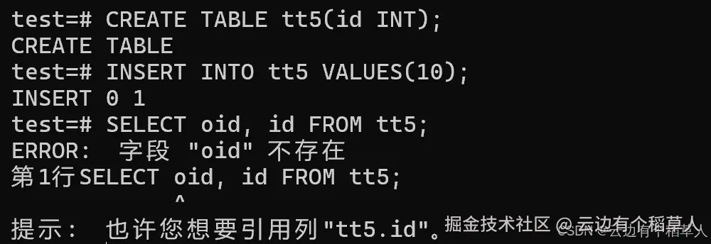 SELECT oid, id FROM tt5; -- 报错:oid字段不存在