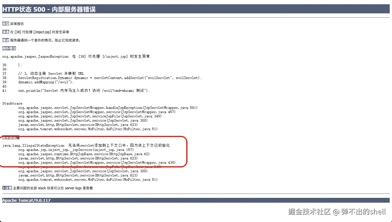如果目标应用本身已经有一个名为 evilServlet 的 Servlet,或存在 /evil 的映射,addServlet 或 addMapping 会抛出异常。在实际渗透中,攻击者通常会使用随机字符串(如 UUID)作为名称和路径,避免冲突。