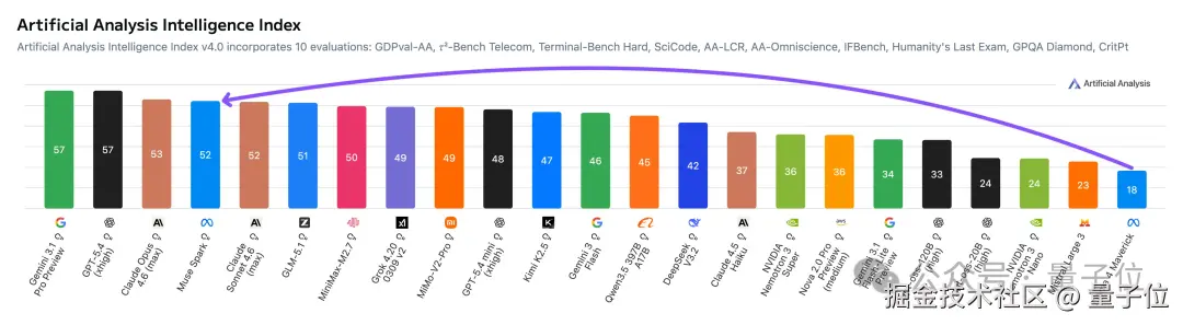 而顶尖高手 + 耗时 9 个月打磨,Muse Spark 也总算让 Meta 在第三方测评中赶上第一梯队,一雪 llama 4 带来的前耻。