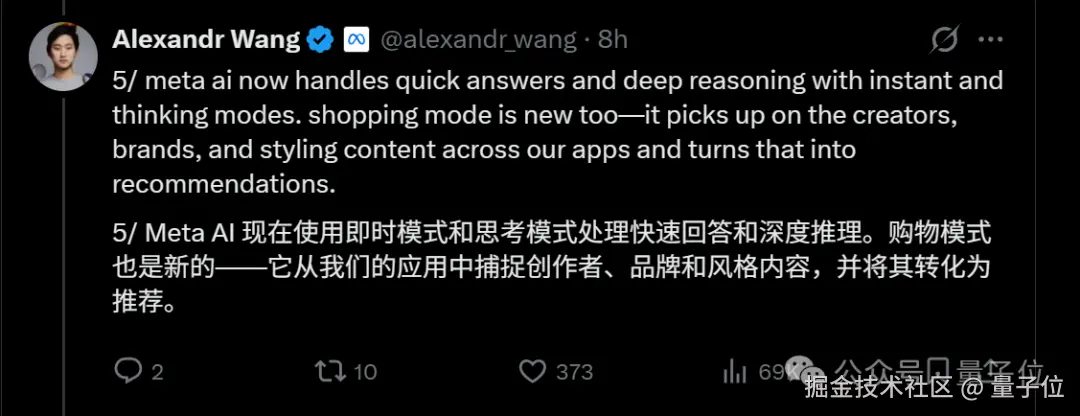 亚历山大王表示,模型会结合用户在 ins、Facebook、Threads 上关注的创作者和品牌偏好,做个性化的购物推荐。
