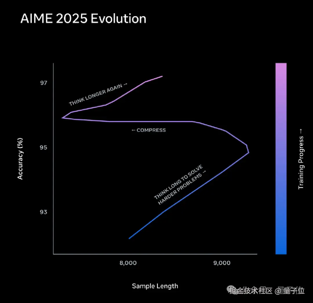 然后在 AIME 这类高难度评测集上,他们观察到了一个有趣的 “三阶段变化”: