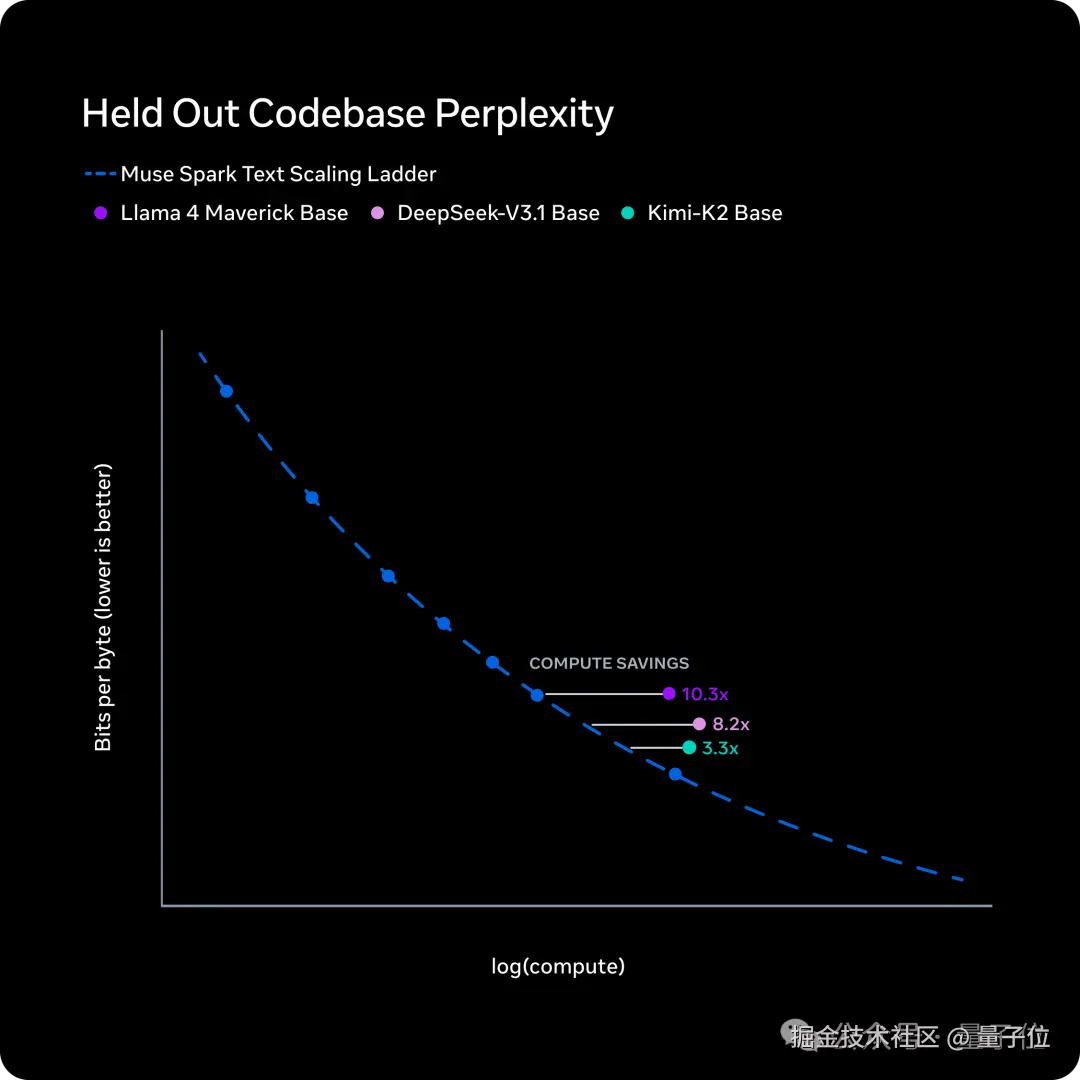 结果发现,相比 Llama 4,Muse Spark 达到同样水平所需要的计算量低了一个数量级以上_(10.3 倍)_。