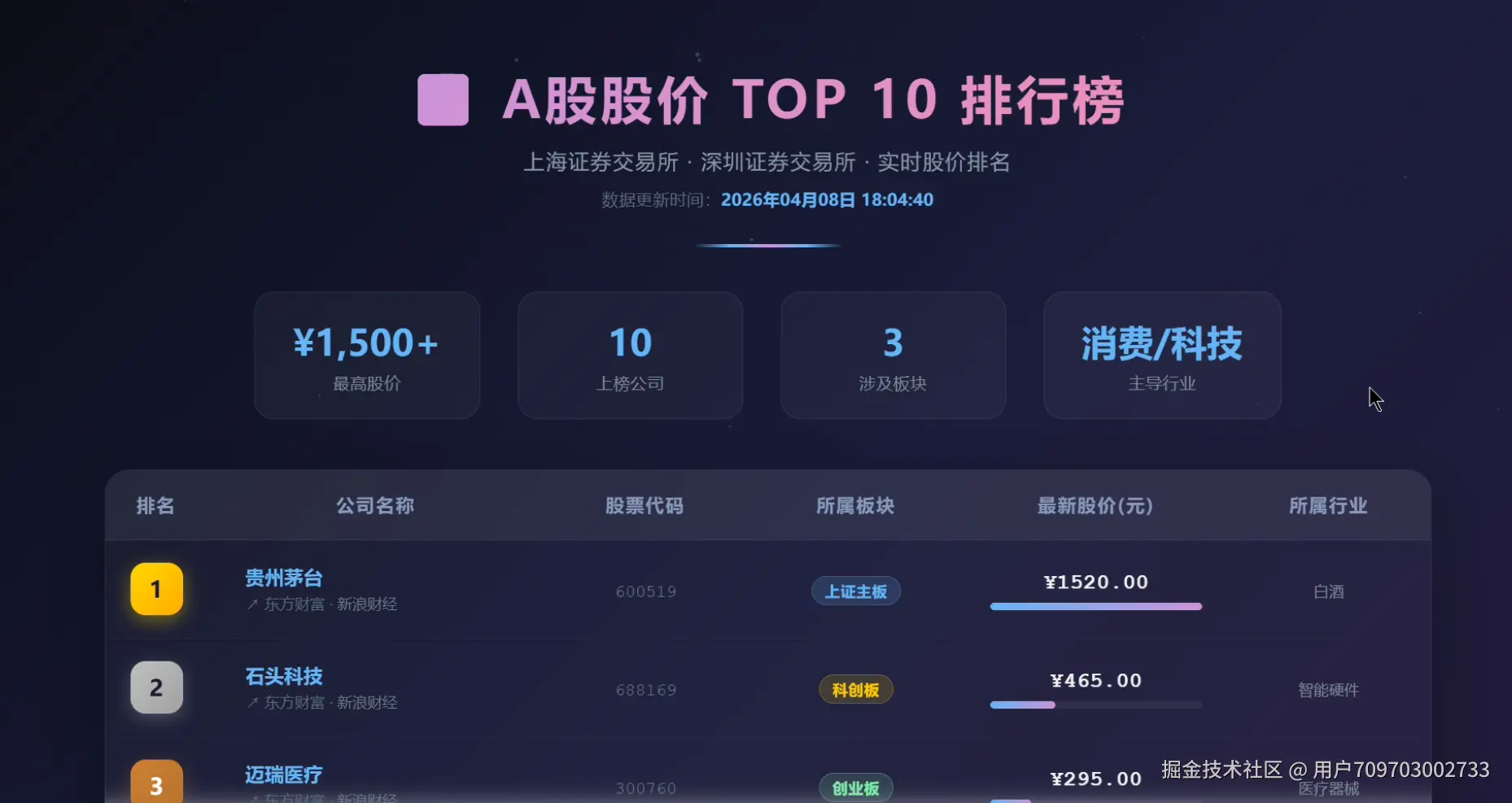 统计目前 A 股市场市值最高的 10 家公司,生成一个交互式统计网页,且每家公司名称需支持链接至第三方行情页面。