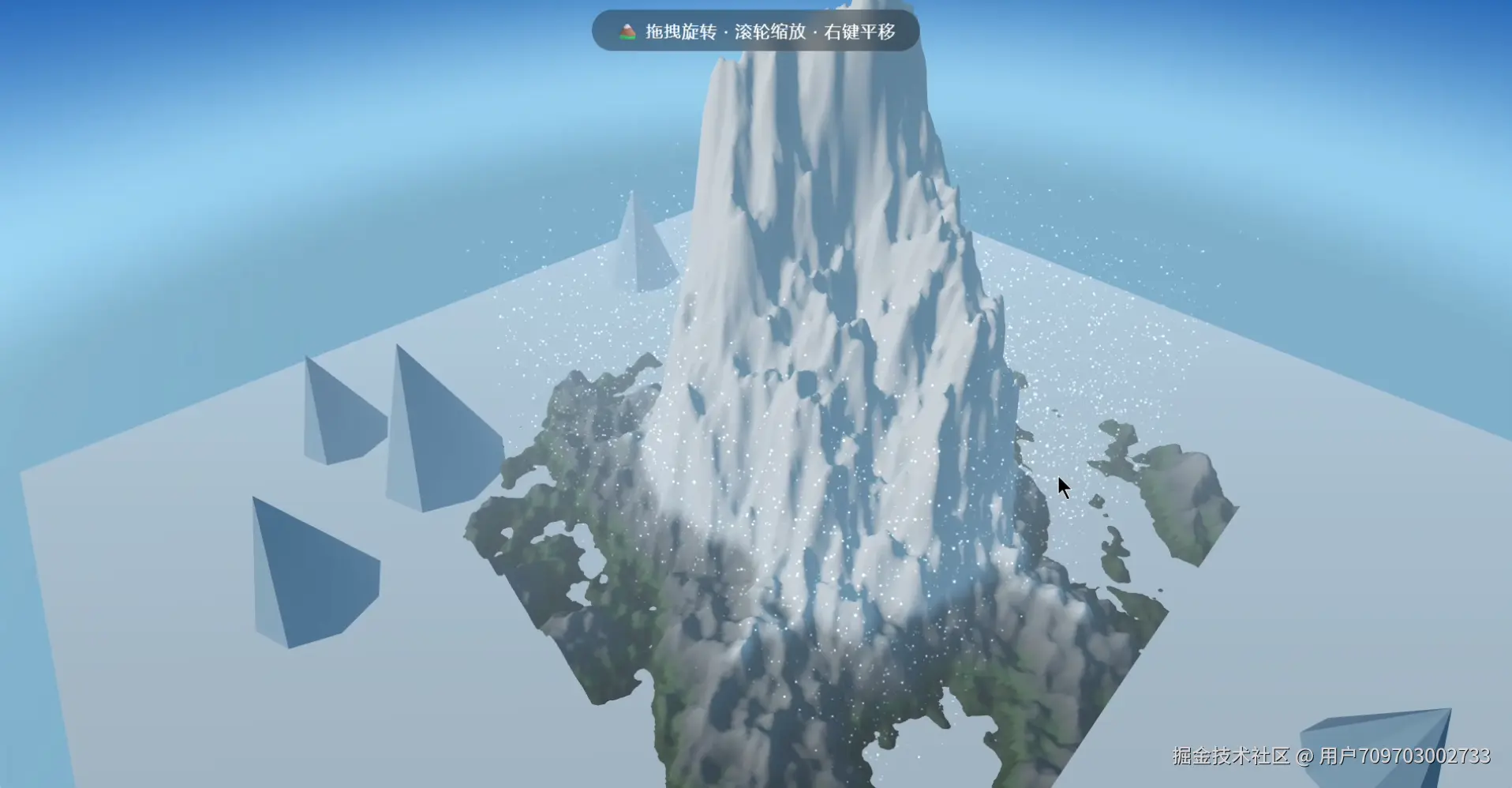 不足之处:受限于单次输出的篇幅,雪山的地形主要由基础几何体组合而成。若需追求电影级的地表纹理,仍需进一步提供纹理映射等细化指令。