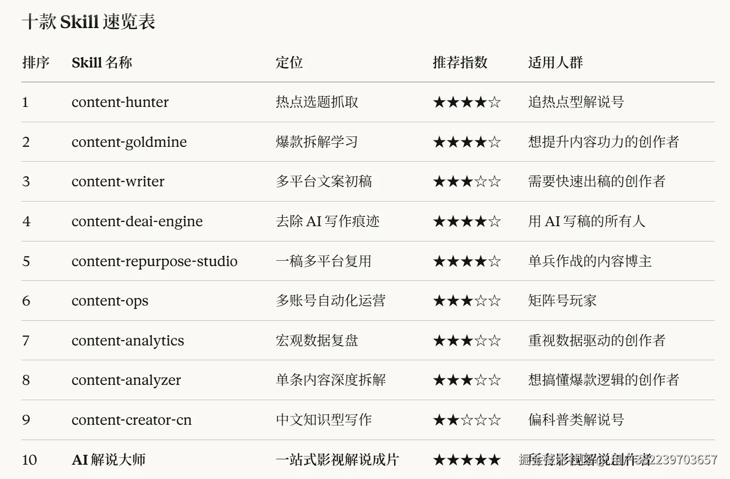 十款 Skill 速览表