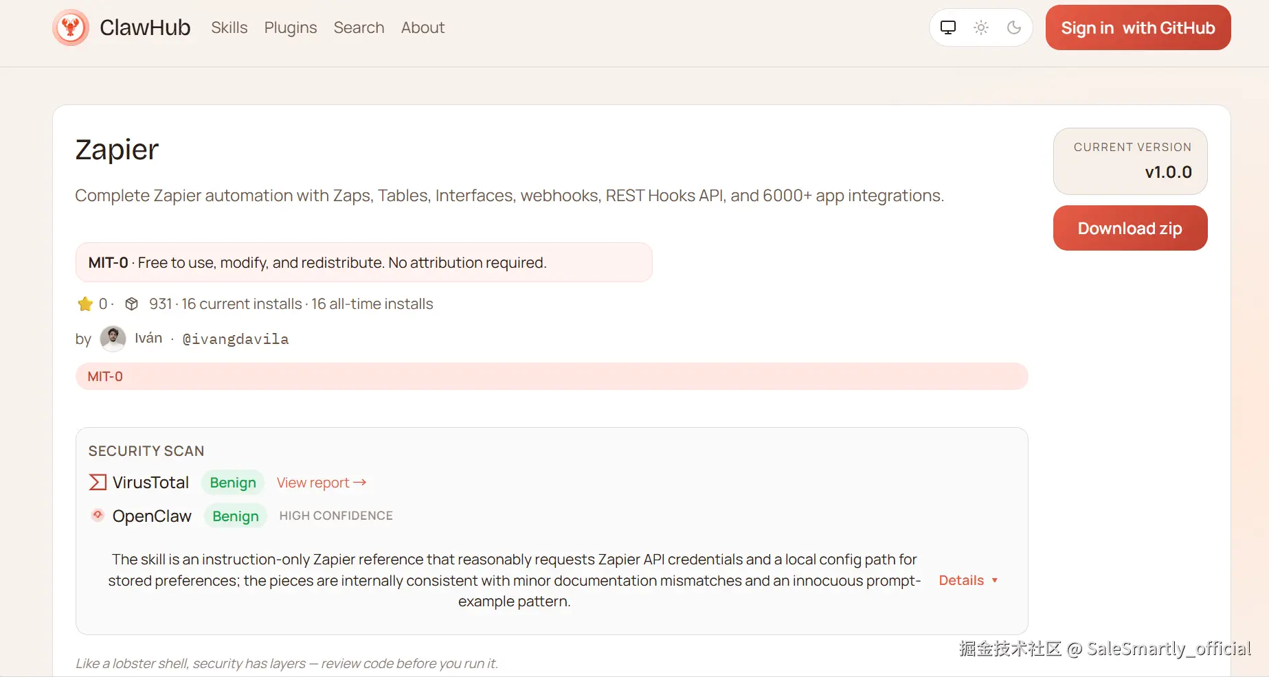 "帮我安装这个 Zapier的技能包:clawhub.ai/ivangdavila…