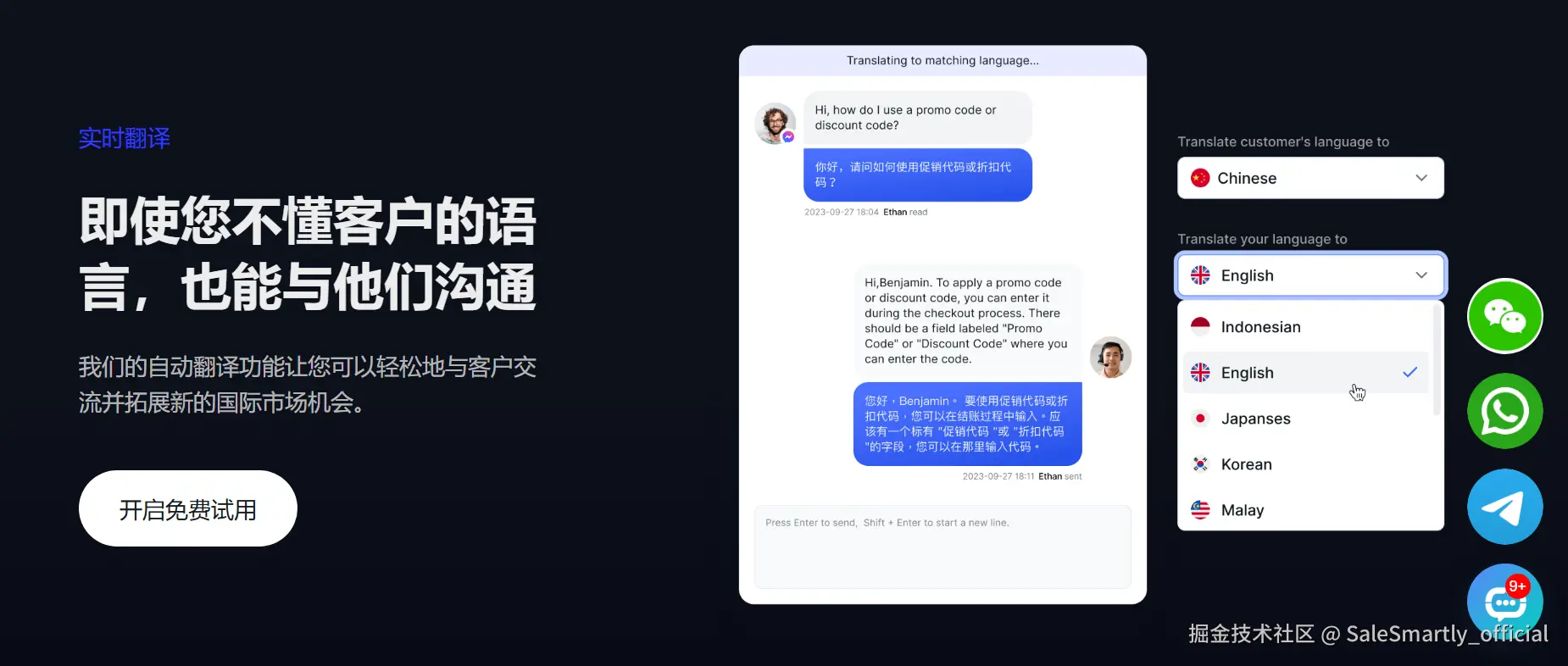 借助 SaleSmartly 的 134 种语言实时翻译功能,你和客户之间的沟通可以实现真正的"双向汉化":客户用英文发来的消息,你看到的是中文;你用中文回复,客户收到的是英文。