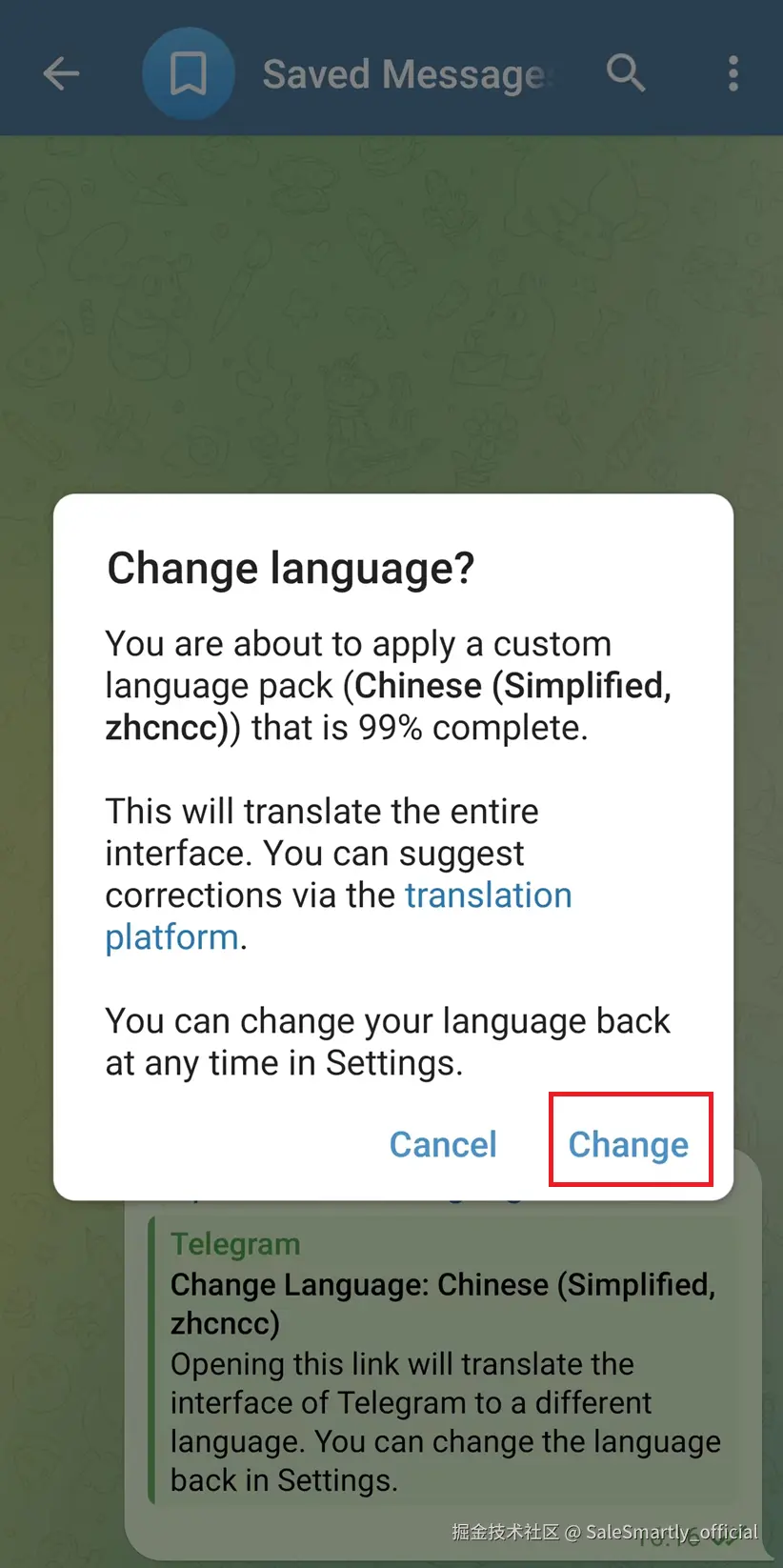 可以重新点击语言包链接,Telegram 会提示当前翻译完成度及版本信息。如有更新,重新点击「Apply Language」即可完成刷新,无需卸载重装。