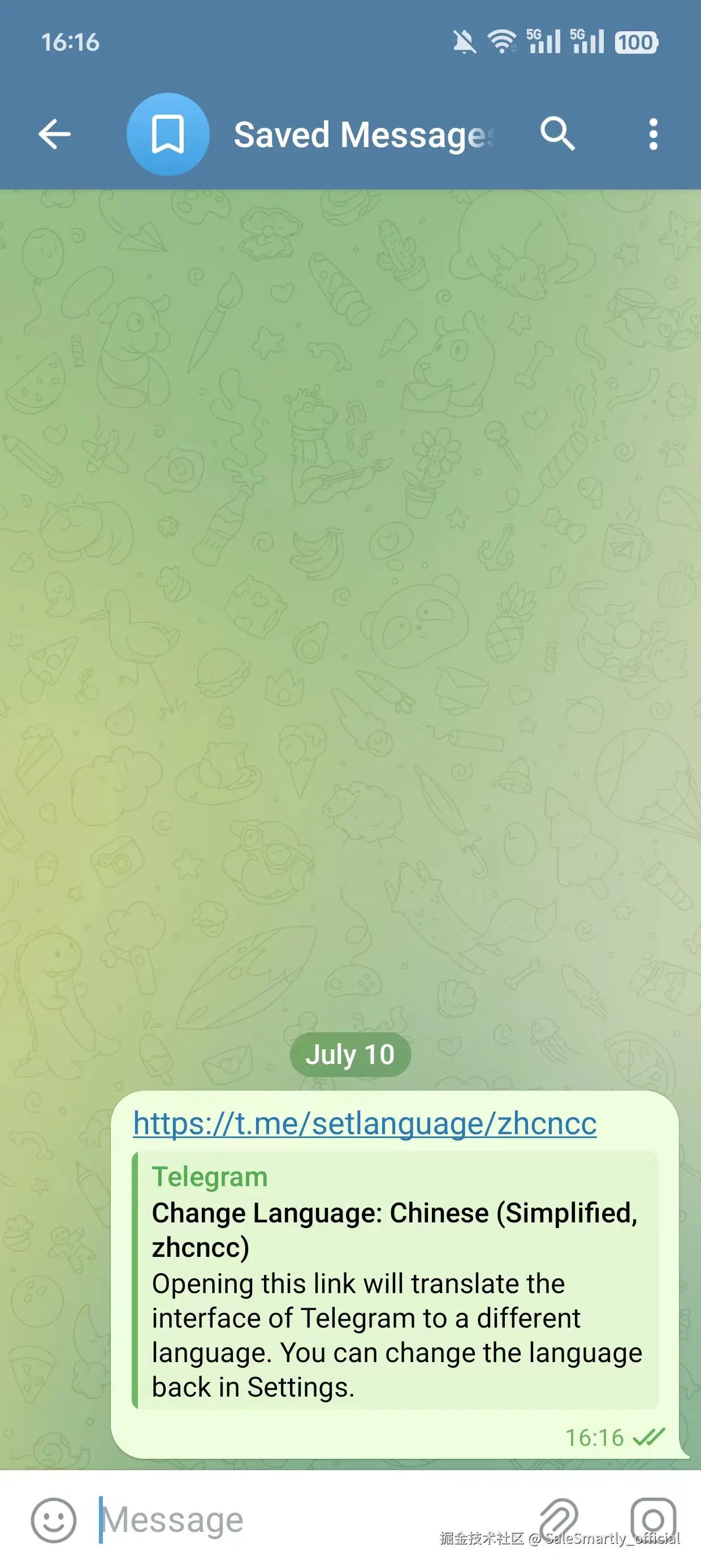 将适合需求的中文语言包链接复制并粘贴到 Telegram 的 “Saved Messages” (已保存的信息)中。