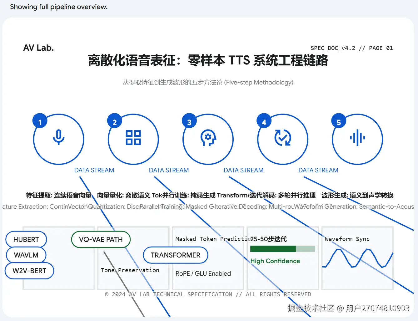 这就引出了语音生成系统的一个核心组件:离散化语音表征。整个零样本 TTS 系统的搭建,往往可以拆解成这样一个工程链路: