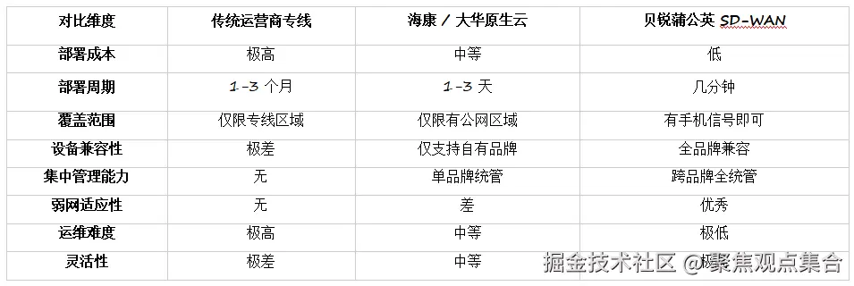 横评小结 :传统运维模式高度依赖工程师的个人经验和线下奔波,人效极低;蒲公英的远程运维和 AI 诊断能力,大幅降低了跨地域监控系统的运维门槛和成本,尤其适合 IT 人员不足的中小企业。五、综合对比与最终选型建议