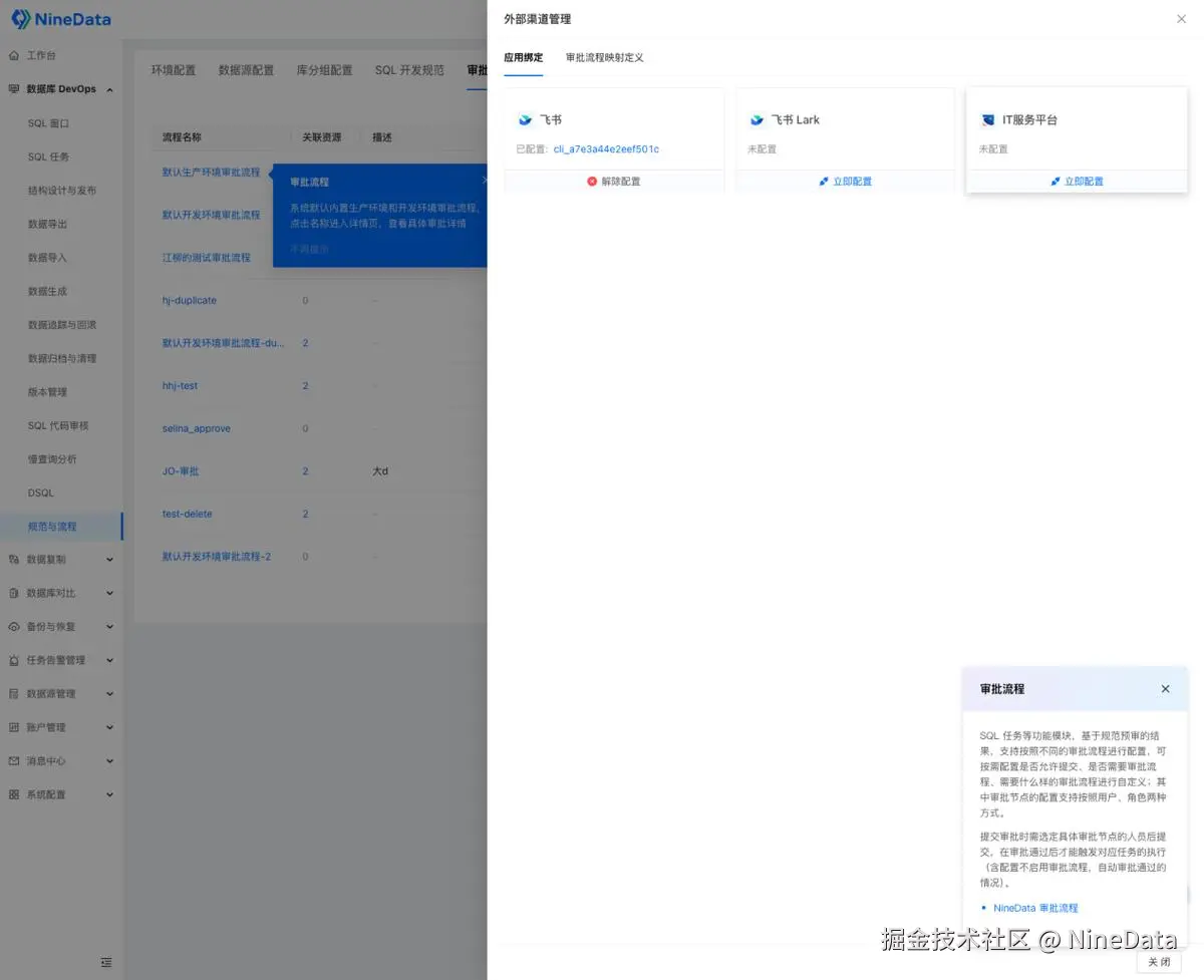 3 月新增支持 飞书 Lark 外部审批,可将 SQL 任务、权限申请、数据导出等流程接入企业现有 Lark 审批体系,在熟悉的协同工具中完成审批闭环。