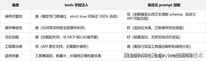 tools 字段保证了调用可靠性但与动态加载存在缓存冲突,工具描述移入 prompt 兼容了缓存但牺牲了格式保证,两者可以混合使用。本地能力用控制台、远程能力用 MCP 的组合是当前的务实选择。