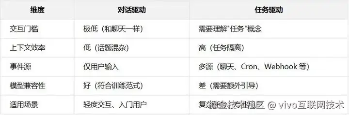 对话驱动门槛低、模型兼容性好,任务驱动灵活、可观测性强,但受制于模型的对话训练倾向。两者可以结合——对话作为前端,任务作为后端。