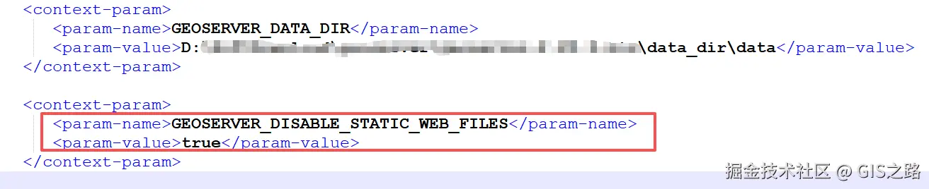 <context-param>标签,修改参数名为GEOSERVER_DISABLE_STATIC_WEB_FILES,参数值为true。