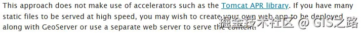 这种方法没有利用加速器,如Tomcat APR库。如果需要高速提供大量静态文件,可能希望创建自己的Web应用程序,与GeoServer一起部署,或者使用单独的Web服务器来提供内容。