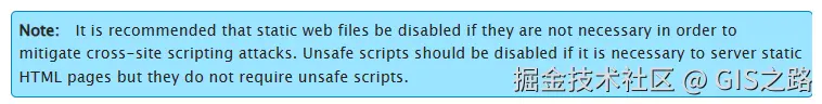 可以将GEOSERVER_DISABLE_STATIC_WEB_FILES属性设置为true,从而在Content-Type HTTP响应头中将text/html和application/javascript内容类型转换为text/plain,这将阻止通过www目录提供网页。