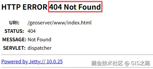 当然,你在浏览器直接输入上述地址是无法访问的,此时的地址栏会变成http://host:8080/geoserver/www/index.html,而在www路径下没有index.html页面,所以直接404,找不到页面。