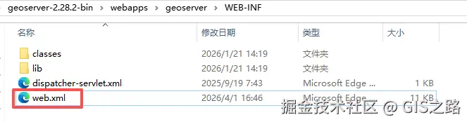 打开geoserver-2.28.2-binwebappsgeoserverWEB-INF目录,编辑web.xml文件。复制一个