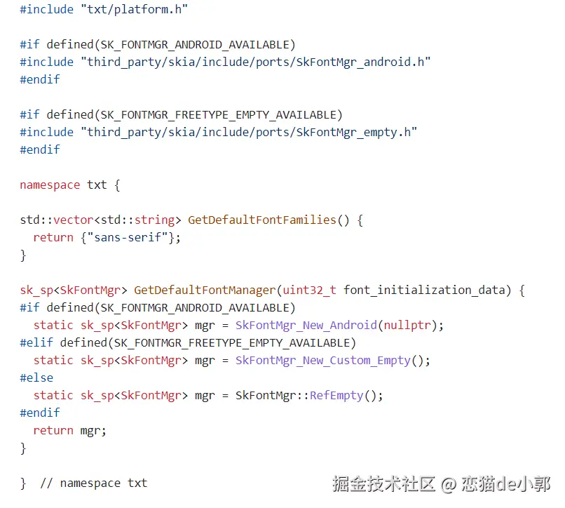 这里的 SkFontMgr_New_Android(nullptr) 就是 Skia 提供的 Android 字体管理器,传入 nullptr 意味着使用默认配置,也就是去解析 /system/etc/fonts.xml 来发现系统字体,这个 SkFontMgr_New_Android 内部就使用了 FreeType 来解析字体文件。